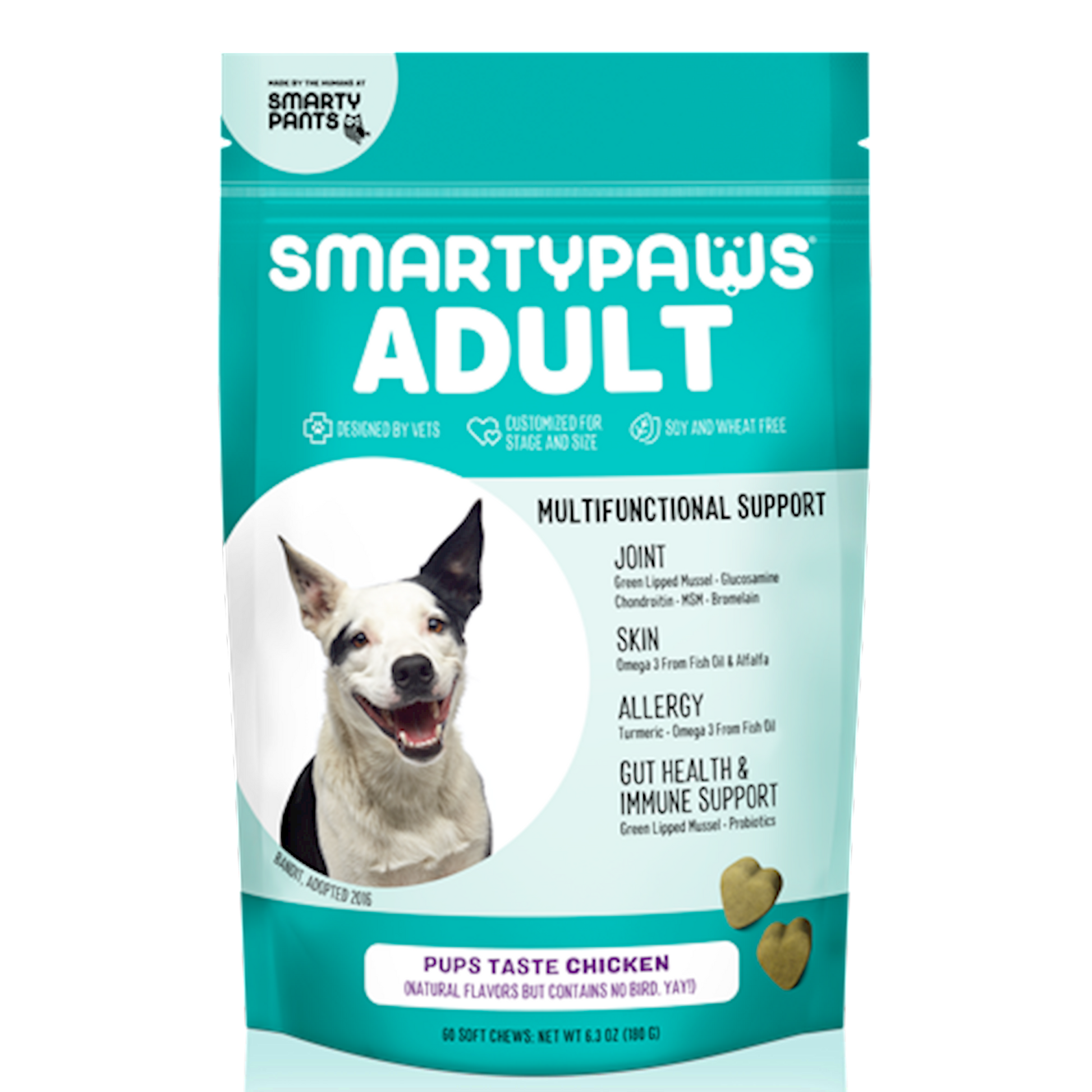 Multi functional Support for Adults We owe them, our dogs. Even if you deduct for the mangled shoes, we owe them for the wags, smooches and pure joy. So, SmartyPants gave them a multifunctional daily chew packed with responsibly sourced ingredients. They also feel an obligation to make the world a better place for all animals. Joint - Green Lipped Mussel Glucosamine Chondroitin MSM Bromelain Skin - Omega 3 From Fish Oil & Alfalfa Allergy - Turmeric Omega 3 From Fish Oil Gut Health and Immune Support - Green Lipped Mussel Probiotics