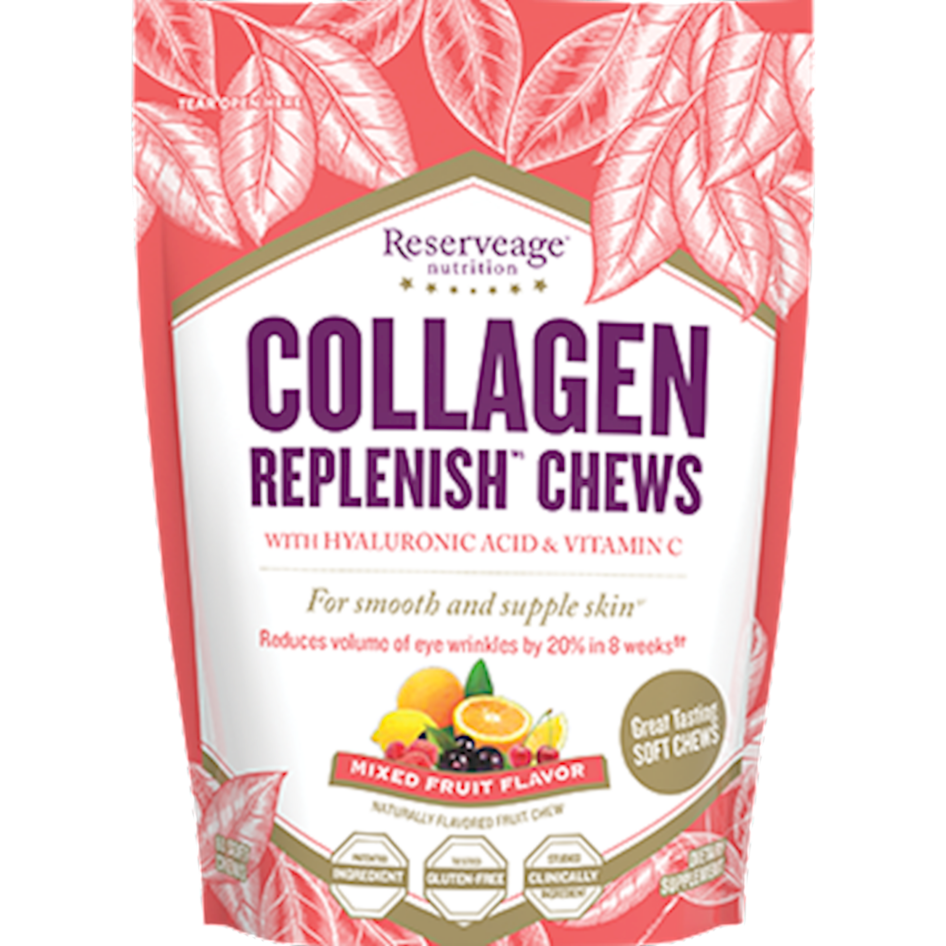 Reduce eye wrinkle volume by 20% in 8 weeks with these powerfuland decadentfruity chews.* Featured in leading health and beauty publications, this deluxe formula promotes skin elasticity and suppleness for visibly smoother skin.* Reserveage's exclusive peptide complex contains a clinically studied and patented ingredient shown to work in two human clinical studies.* Reveal your best self through healthier, smoother skin. Radiance starts with collagenthe beauty protein that contributes to firmness and elasticity*. Collagen Replenish delivers a unique formulation that helps promote collagen production, which steadily decreases after age 30. The exclusive Beauty Peptide Complex includes specially sized collagen peptides that target the mid-layer of skin, where deep wrinkles form.* These delightful, tasty chews are individually wrapped for convenience and portability.