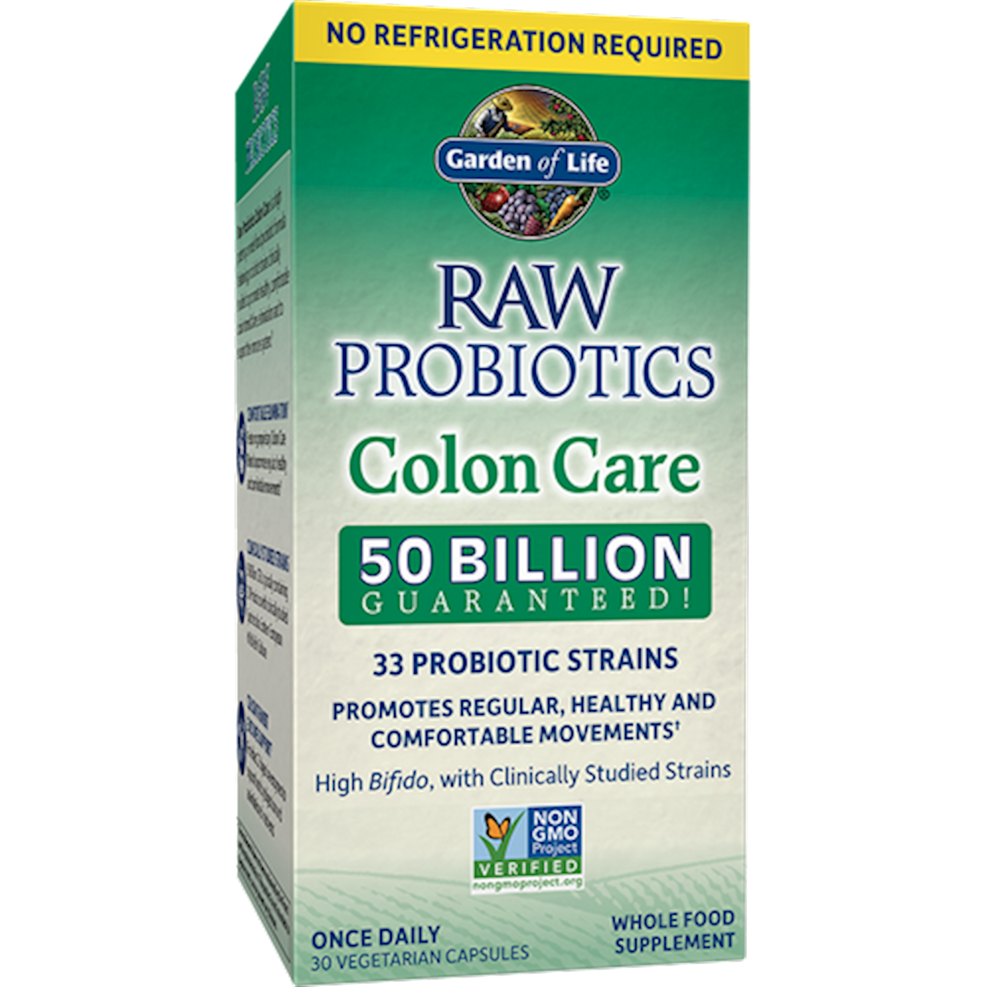 RAW Probiotics is a unique line of high-potency, RAW, whole food probiotics that are age- and gender-specific. Unlike isolated strains of probiotics, RAW Probiotics offers all the benefits of a true food probiotic with a record-setting 30+ probiotic strains. So, its not just isolated bacteria in a pill; RAW Probiotics is a whole-food probiotic that emulates eating fermented food. Made with mainly Bulgarian yogurt concentrate, Wild European kefir grains and scobies, and concentrated clinically studied probiotics strains, RAW Probiotics is created below 40 F and 30% humidity so that what you see on the label is what you get in the bottle. Garden of Life RAW Probiotics Colon Care supports regular, healthy and comfortable movements.* Helps to support a healthy balance of beneficial bacteria in the colon to support a properly functioning digestive system and overall wellbeing.* Each high-potency RAW Probiotics formula contains a naturally diverse group of over 30 beneficial probiotics strains from Bulgarian yogurt and Eastern European wild kefir, guaranteed to Arrive Alive! RAW Probiotics Colon Care is a high-potency, RAW, whole food probiotic formula containing a proprietary Colon Care Blend featuring probiotic strains clinically studied to support healthy, comfortable colon transit time, elimination, and to support the immune system.* What Garden of Life promise on the label is what you get50 billion live probiotic cultures in a convenient once-daily capsule. Garden of Life's shelf Stable, patent-pending desiccant-lined bottle technology ensures your probiotics Arrive Alive! When you need colon probiotic support, turn to Garden of Life RAW Probiotics Colon Care and support your extraordinary health.* Raw Probiotics Colon Care Benefits: A once-daily servingin one small, easy-to-swallow capsule Has 33 RAW probiotic strains supporting flora diversity as found in nature* Features proprietary Colon Care Blend to support regular, healthy and comfortable movements* Provides 17 digestive enzymes to support healthy digestion and assimilation of nutrients* Arrive Alive! Potency Promise No Binders, Fillers or Carriers RAW Probiotics Colon Carea high-potency, RAW, whole food probiotic formula containing a proprietary Colon Care Blend featuring probiotic strains clinically studied to support healthy, comfortable colon transit time, elimination, and to support the immune system.*